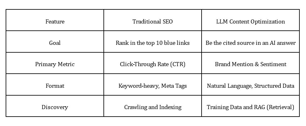 This is the era of AI discovery. If you want to keep seeing success as a marketer, you need to get comfortable with LLM optimization and understand how it differs from traditional SEO. The goal is no longer just to rank as a link on a page, but to become the clear, trusted answer AI tools surface first.